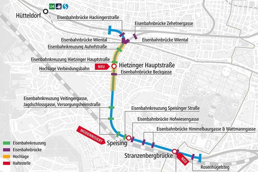 Die Verbindungsbahn soll von Hütteldorf bis zum Rosenhügelsteg modernisiert werden. Zwischen Weststrecke und Auhofstraße ist ein zweites Gleis vorgesehen...